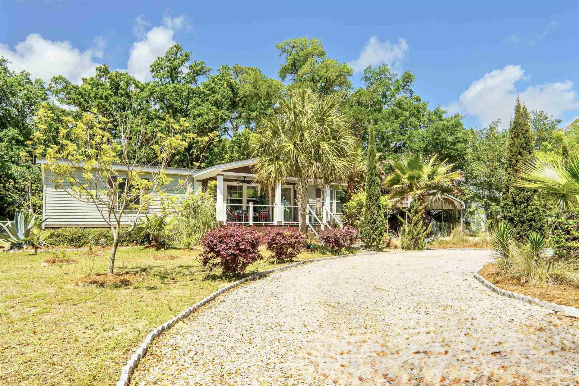 This beautifully maintained 2015 manufactured home offers a bright, open layout with a spacious kitchen and living area filled with natural light. Large windows bring the outdoors in and make the whole home feel warm and welcoming. The inviting setting and curved driveway create a charming first impression, enhancing the home's sense of privacy and space. Enjoy both a covered front porch and a private back porch, along with beautifully landscaped outdoor areas that create a peaceful, almost vacation-like setting. The tied-down unit adds stability and peace of mind, while a newer roof (approximately 5 years old) provides additional value....read more